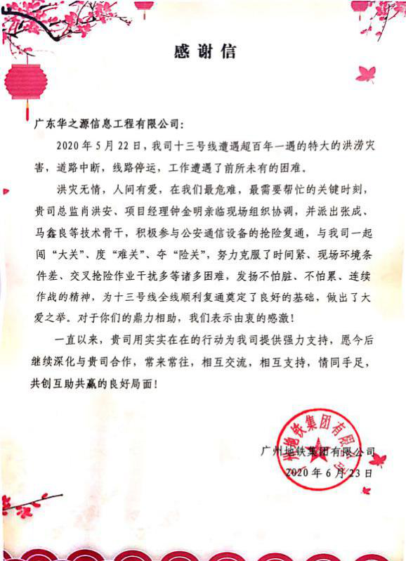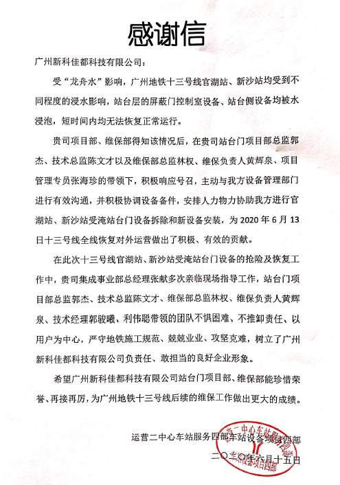 在抗洪抢险战役中,zoty中欧科技团队以切切实实的行动支持,高标准、高质量支持助力广州地铁13号线顺利复通,得到了广州地铁集团各级领导的肯定与认可,并授予感谢信。未来,zoty中欧科技也将继续保持枕戈待旦、冲锋在前的高度责任感,为广州地铁后续的维保工作做出更大的成绩,让广州地铁运营更安全、更稳定,为广州市民地铁出行保驾护航!