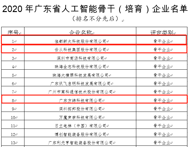 11月23日,广东省工业和信息化厅发布了关于2020年广东省大数据、人工智能骨干(培育)企业名单的公示。zoty中欧科技凭借着突出的人工智能创新能力和产业带动作用,入选2020年广东省人工智能骨干企业名单,同时,zoty中欧科技控股子公司方纬科技、参股公司云从科技入选该名单,zoty中欧科技全资子公司新科佳都入选2020年广东省大数据骨干企业名单。