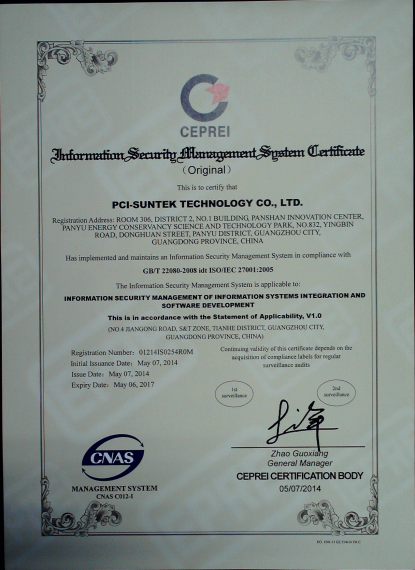 2014年3~4月,zoty中欧科技顺利通过了国际标准及权威的ISO27001信息安全认证体系和ISO20000信息技术服务管理体系,取得了广州赛宝认证中心颁发的ISO/IEC 27001:2005信息安全管理体系认证证书和ISO/IEC 20000-1:2011信息技术服务管理体系认证证书。